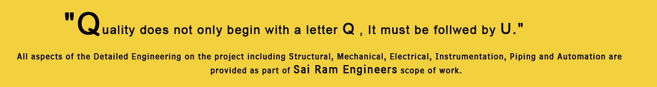 Sai Ram Engineers has a fully staffed team of Engineers that provides complete one-stop engineering services. The Basic Design Engineering for our projects in based on our technical collaboration with our different partners . depending on the type of plant required. All aspects of the Detailed Engineering on the project including Structural, Mechanical, Electrical, Instrumentation, Piping and Automation are provided as part of Sai Ram Engineers scope of work. |